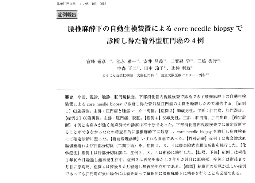 本論文は投稿論文です。肛門には肛門腺という器官があり、頻度は多くありませんが肛門腺が癌化する肛門管癌が時に見られます。このタイプは粘膜の下から発生するため粘膜面にさほど異常が認められません。圧激痛が見られます。このタイプを管外型、通常タイプは管内型と分類することもあります。内視鏡での発見はしにくいため(粘膜の変化が乏しいため)内視鏡下の生検でも癌細胞が検出されにくいのです。今回、私たちは乳癌の診断などに使用する自動生検装置を用いた針生検を下半身麻酔(脊椎麻酔)下に4例に行い診断できました(全例内視鏡検査では診断が付きませんでした)。