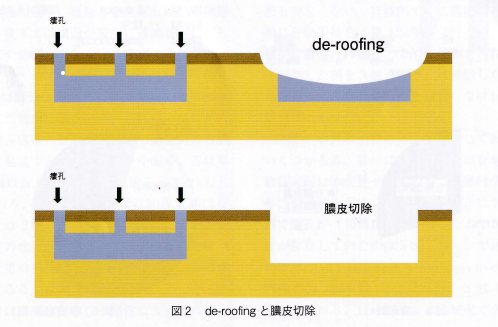 対象は17例で全例男性でした。年齢は25-62(中央値46)歳で30代が最多でした。病悩期間は「1-9年」が最多で10年以上は6例(35%)でした。瘻孔数は10個以上が71%で手術が1回で済んだのは12例(71%)でした。逆に考えると1回で済まなかったのは5例(29%)です。痔瘻合併は5例(29%)でした。痔瘻の合併頻度は前論文とほぼ同じでしたので妥当な頻度と考えています。手術は膿皮切除とde-loofing(図)の組み合わせたものが基本で痔瘻が合併していればその痔瘻に準じた術式を付加しています。ただし傷跡は大きく残るため美容面では課題が残ります。最近ではInfliximabやAdalimumabなどの生物学的製剤が使われるようになっています。Adalimumabは本邦でも保険適応になっています。