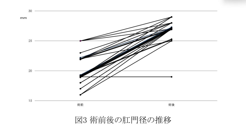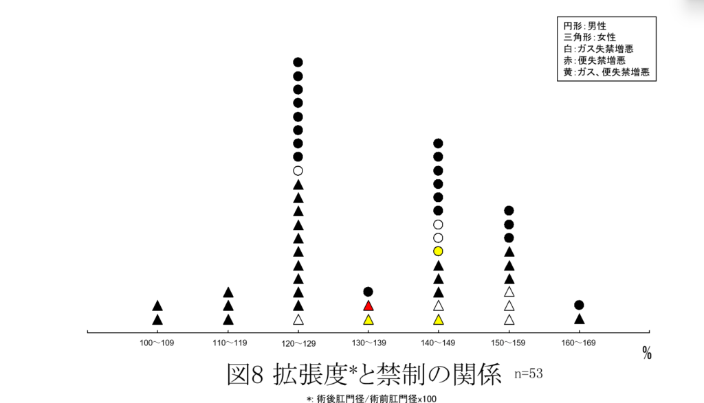 狭窄型の慢性裂肛に対する本術式は肛門を広げることが目的ではありません。元は痔核術後の狭窄にたいする術式(Carmel)でした。本邦では慢性裂肛に行われるようになったのです。肛門の緊張を軽減することが目的です。よって広げ過ぎてはならないのです。しかし術中にその尺度となるのは肛門径しかないため拡張度に注目して後ろ向きに検討しました。その結果ガス失禁や便失禁を術後に呈する症例は女性で130%、男性で140%拡張がボーダーラインと考えられました。私たちは以後この数字をメルクマールとして利用するようにしています。