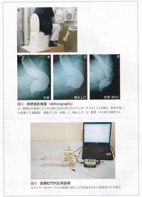 図2は排便に関係する加齢による変化です。前後しますが図7は便の形状を表す国際的な分類です。「硬い」、「軟らかい」などは個人の主観によるものが大きいので曖昧です。このような図で示す方が患者-医師間の共通の認識として双方の理解が可能となります。図3、図4はガイドラインからの分類を一部変えて載せています。本ガイドラインの最大の功績は直腸肛門にまつわる慢性便秘を「便排出障害」と命名したことであると言っても過言ではありません。このことによりより慢性便秘症の理解がしやすくなりました。ただ便排出障害の診断は難しく機能性消化管障害Roma分類では表1の様に規定されています。専門的な検査が必要です(図5、6)。病態を無視した投薬では症状は改善しないこともある事を内科系医師に知っていただきたいです。