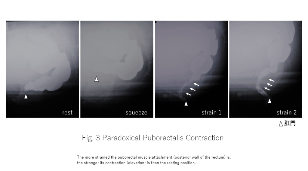 図3 本来でしたら怒責時に肛門括約筋と肛門挙筋は弛緩するはずですがこの所見では肛門挙筋(恥骨直腸筋)が逆に収縮しています。