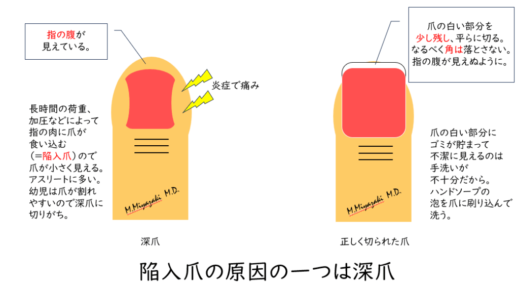 この季節よく外来に来られる患者さんに陥入爪の方がおられます。今回は陥入爪について少し説明を します。