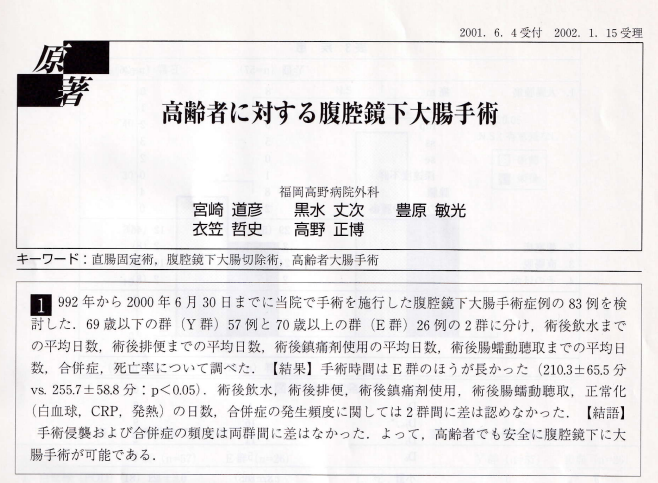 対象は86例で69歳以下と70歳以上に分けて後方視的に二群間比較を行いました。ただし二群は疾患がそろっていません。結果は身体の回復、合併症発生などに有意な差は認めませんでした。よって腹腔鏡下大腸手術は高齢者にも優しい治療ではないかと結論付けました。