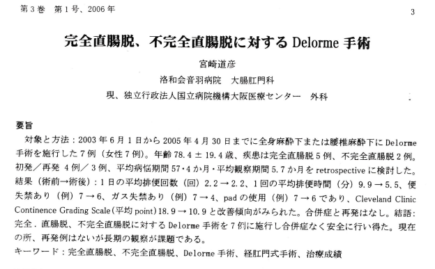 泌尿器科・婦人科系学会への投稿論文です。完全直腸脱に対する経肛門的手術の一つであるDelorme手術の治療成績です。Delorme手術は手技が煩雑で本術式を施行している身近な先生がおられないため学会でよくお会いし、今も尊敬するお一人のT先生(ご本人は私に尊敬されているとは知りません)に学会会場で直接お願いし一つ返事でビデオを送っていただきました。T先生は当時この手術を率先してやっておられました。ビデオのクオリティが高いので何度も見て研究しました。その初期の頃の7例(平均年齢78歳)の後方視的検討です。これまで国内では病態を無視したGant-Miwa手術がまだ行われていて再発が多かったのです。Delorme手術は病態に見合った良い手術ですが長期的に観察しなければ安心できないという結論です。