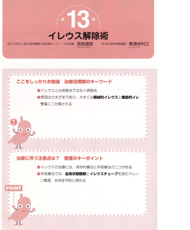 イレウスとは腸閉塞のことで癒着、食餌、捻転、炎症、癌など様々な原因で腸内容物が流れなくなる状態を言います。ひどい時は口から便が噴出し致命的な状態になることもあります。イレウスが起こり、腸の拡張が伴っている時には2 m近くあるイレウスチューブを鼻から挿入します。十二指腸まで入れた後は先端に付いている風船を膨らまします。あとは腸の動きに乗って自然に肛門側へ入っていきます(不思議ですよね)。その際チューブの根元はタイマー式吸引器につなぎ腸液を吸引し続け拡張した腸をしぼませて行きます。そうすることで痛みや膨満感が取れて行きます。途中で進行が停滞する場合はそこが閉塞部位と判断し手術に踏み切ります。この書では留置した後の輸液管理にも注意が必要であると述べています。