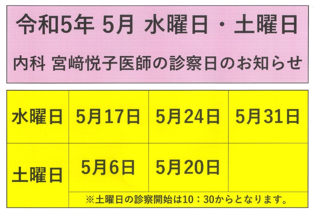 新着情報 診察担当日令和5年 5月 水曜日・土曜日 内科 宮﨑悦子医師の診察日のお知らせ 令和5年 5月 水曜日・土曜日 内科 宮﨑悦子医師の診察日のお知らせ 2023.04.29 診察担当日 «新しい記事 一覧に戻る 以前の記事»