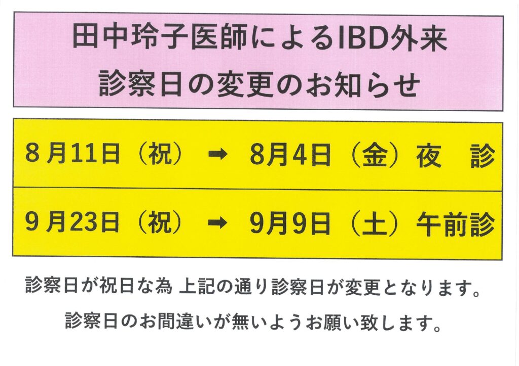 田中玲子医師によるIBD外来診察日の変更のお知らせ