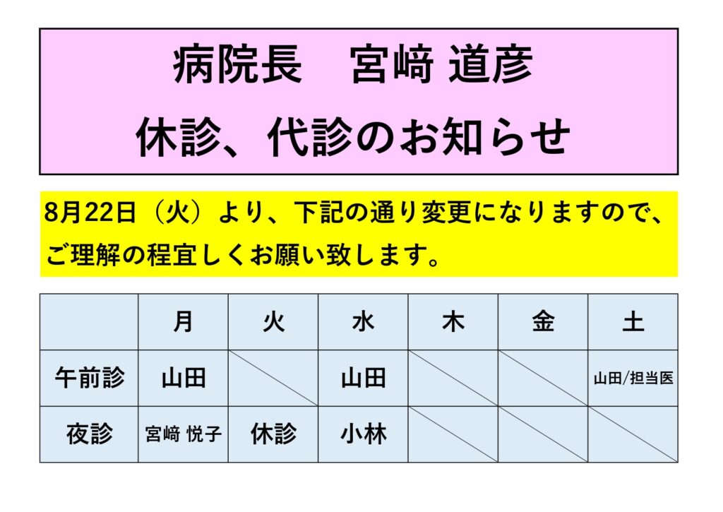 新着情報 休診・代診令和5年8月22日より 病院長 宮﨑道彦 休診、代診のお知らせ 令和5年8月22日より 病院長 宮﨑道彦 休診、代診のお知らせ 2023.08.02 休診・代診 «新しい記事 一覧に戻る 以前の記事»