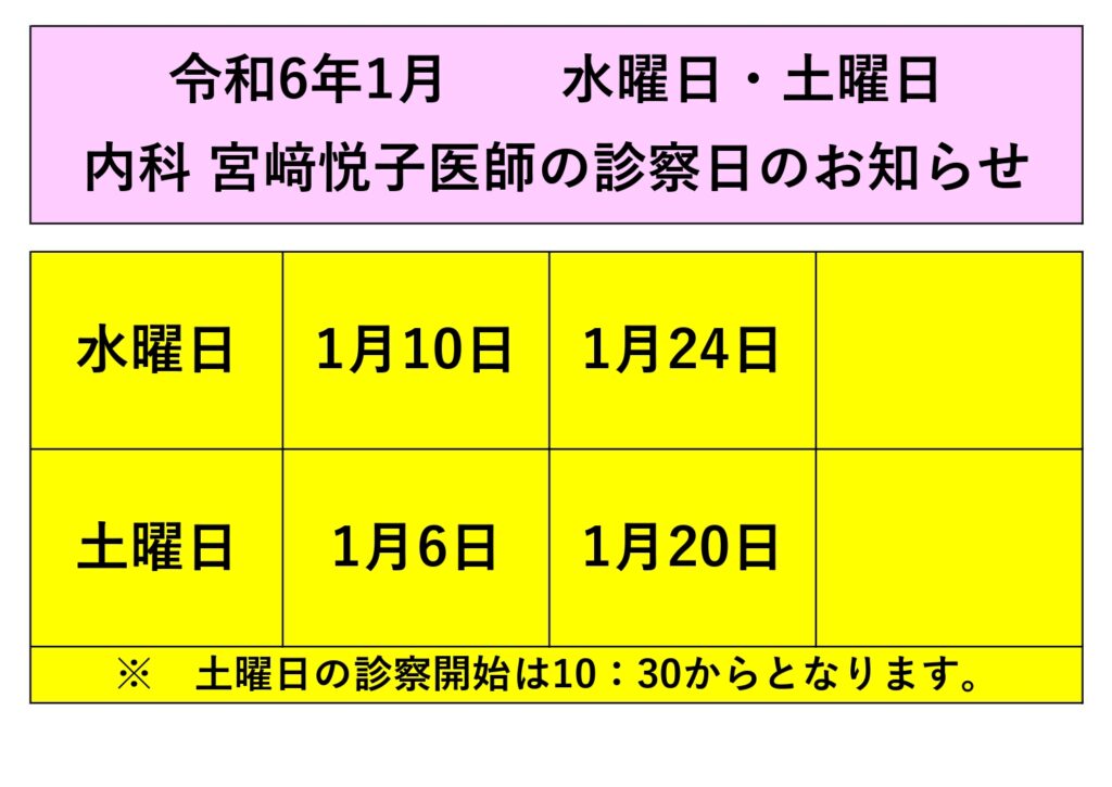 令和6年1月 水曜日・土曜日 内科宮﨑悦子医師の診察日のお知らせ