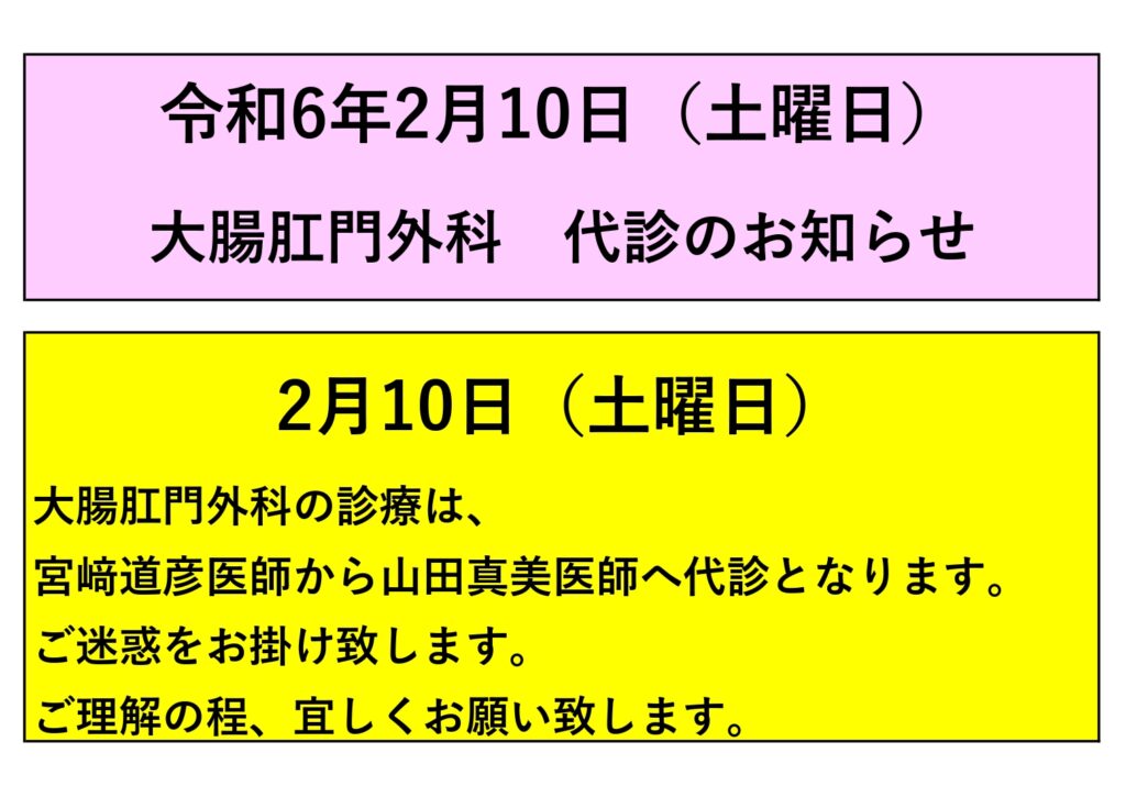 令和6年2月10日(土曜日) 大腸肛門外科 代診のお知らせ