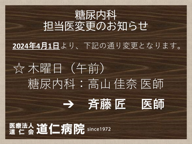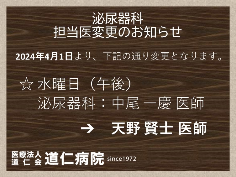 新着情報 お知らせ外来担当医師一部変更についてお知らせ 外来担当医師一部変更についてお知らせ 2024.02.27 お知らせ 人事異動により令和6年4月より外来担当医の一部変更がございます。 毎週水曜日 ➡ 午後外来 泌尿器科 担当医変更毎週木曜日 ➡ 午前外来 糖尿内科 担当医変更 ご迷惑をおかけ致しますが、ご理解の程宜しくお願い申し上げます。 «新しい記事 一覧に戻る 以前の記事»