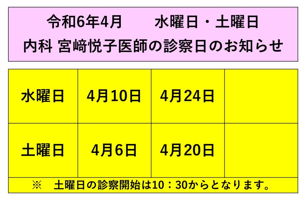 新着情報 診察担当日令和6年4月 水曜日・土曜日 内科宮﨑悦子医師の診察日のお知らせ 令和6年4月 水曜日・土曜日 内科宮﨑悦子医師の診察日のお知らせ 2024.03.28 診察担当日 «新しい記事 一覧に戻る 以前の記事»