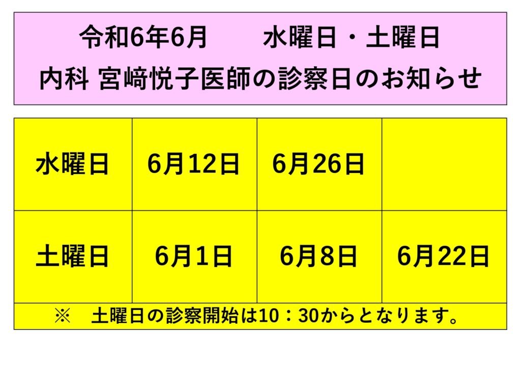 新着情報 診察担当日令和6年6月 水曜日・土曜日 内科宮﨑悦子医師の診察日のお知らせ 令和6年6月 水曜日・土曜日 内科宮﨑悦子医師の診察日のお知らせ 2024.05.29 診察担当日 «新しい記事 一覧に戻る 以前の記事»