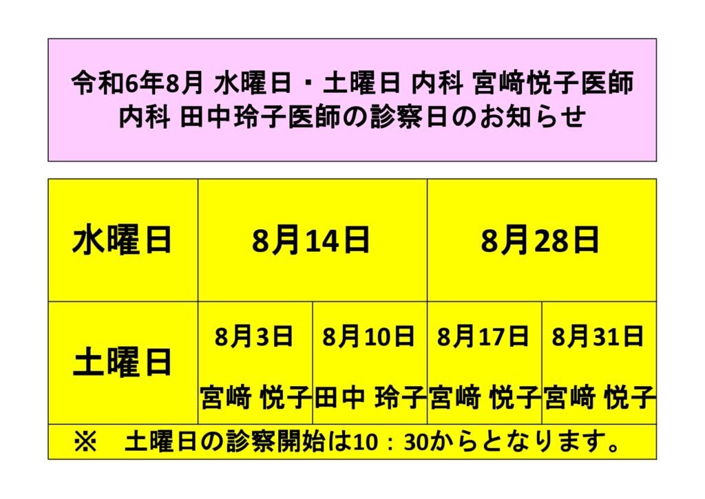 新着情報 診察担当日令和6年8月 水曜日・土曜日 内科宮﨑悦子医師 内科田中玲子医師 診察日のお知らせ 令和6年8月 水曜日・土曜日 内科宮﨑悦子医師 内科田中玲子医師 診察日のお知らせ 2024.07.29 診察担当日 «新しい記事 一覧に戻る 以前の記事»